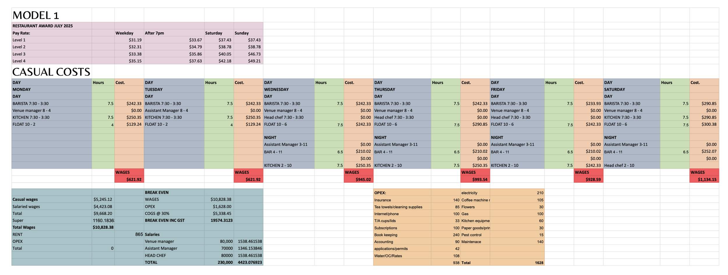 Please see our wage forecasting and modelling below. Please note that the break even is excluding rent.